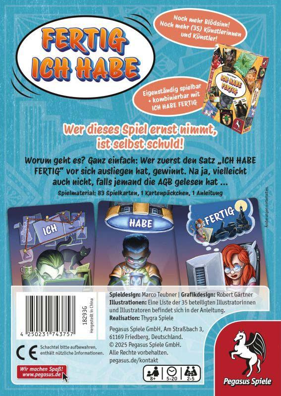 Das Spielprinzip ist leicht erklärt: Wer am Zug ist, darf entweder eine Karte vom Nachziehstapel auf die Hand nehmen oder eine Handkarte ausspielen und tun, was die Karte verlangt. Gespielt wird im Uhrzeigersinn und wer gewinnen will, muss als erstes die drei Zielkarten „FERTIG“, „ICH“ und „HABE“ vor sich ausliegen haben. Aber die Spielanleitung gilt hier eher als Richtlinie: Was passiert, entscheiden die chaotischen Karten. Zum Beispiel sorgt das „Müllrad“ dafür, dass der Ablagestapel in den Nachziehstapel gemischt wird und zwei Karten nachgezogen werden. Oder es folgt eine „Überraschung“, ein „Befehl von ganz, ganz oben“ oder „Schrödingers Albtraum“, was das Spiel ganz schön aufmischen kann … 83 neue Spielkarten, illustriert von 35 Künstler*innen sorgen für noch mehr Wendungen und noch mehr Blödsinn.