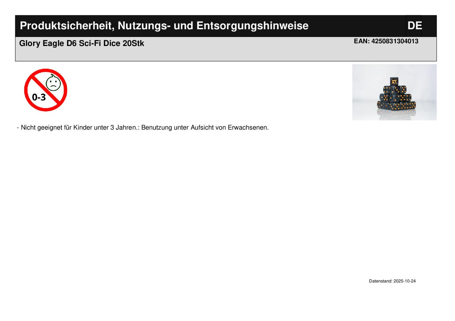 Glory Eagle - 20 StückDas Glory Eagle Würfelset glänzt in tiefem Schwarz mit goldenen Augen - edel, würdevoll und überirdisch wie die Krieger, denen es gewidmet ist. Das eingravierte Symbol des geflügelten Ruhms steht für Unsterblichkeit, unantastbare Ehre und die letzte Verteidigung des Throns selbst. Jeder Wurf ist das Urteil eines unfehlbaren Champions, gesprochen mit dem Gewicht von Jahrtausenden an Pflicht. Diese Würfel gehören nur jenen, die für das Licht des Imperators nicht kämpfen - sondern es verkörpern. DiceWyrm Glory Eagle - wo andere scheitern, beginnt ihre Ewigkeit.Sci-FI WürfelTauche ein in ferne Galaxien mit den SciFi-Würfelsets von DiceWyrm - 20-teilig, präzise gefertigt und inspiriert von den Abgründen einer düsteren Zukunft. Jedes Set vereint futuristisches Design mit funktionaler Klarheit und bringt kybernetische Muster, maschinelle Gravuren und kalte Eleganz auf deinen Spieltisch. Ob für brutale Schlachten, taktische Simulationen oder dystopische Erzählungen - diese Würfel sind gemacht für harte Entscheidungen in rauen Welten. Ausgewogen im Wurf, robust im Einsatz, bereit für das Unbekannte. DiceWyrm SciFi - für Spielende, die in Stahl und Schatten würfeln.DiceWyrmDiceWyrm steht für meisterhafte Würfel, geschmiedet für Abenteurer, Strategen und Geschichtenerzähler. Unsere Würfel vereinen höchste Präzision mit langlebiger Qualität und sind gemacht, um Schlachten zu schlagen - ob in finsteren Dungeons oder weit entfernten Galaxien. Jedes Set wird mit Liebe zum Detail gefertigt und reflektiert die Vielfalt fantastischer Welten, von epischer Fantasy bis zu düsterer Science-Fiction.Ob für Pen & Paper, Tabletop oder TCG - DiceWyrm bietet dir das passende Werkzeug, um dein Schicksal stilvoll zu besiegeln. Unsere Designs reichen von mystisch und uralt bis futuristisch und technisch. Sammler und Spieler schätzen die Balance, das Finish und das charakterstarke Design jeder Edition. DiceWyrm - weil kein Wurf dem Zufall überlassen bleiben sollte.Denn jedes Spiel verdient es, episch zu sein. Und jeder Wurf sollte sich legendär anfühlen.The Wyrm waits! Roll Boldly.Dies ist ein Original von DiceWyrm und stehen in keiner Verbindung zu Mantic Games, Games Workshop, Kings of War, Star Wars oder anderen Marken.