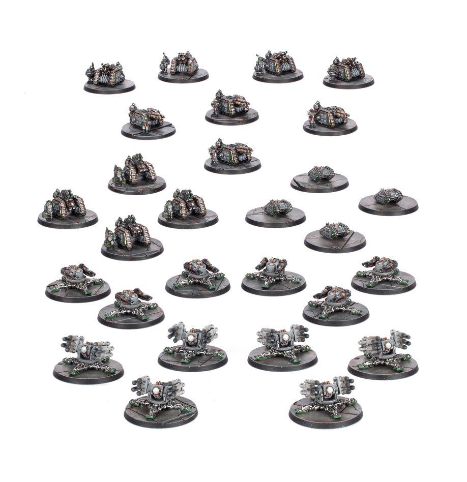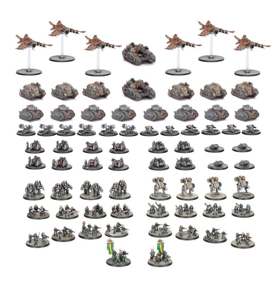 Vier der Rapiers können mit Quad Launchers, vier mit Laser Destroyer Arrays und vier mit Mole Mortars gebaut werden. Sechs der Tarantulas können mit Hyperios Air-defense Missile Launchers und sechs mit Tarantula Lascannon Batteries gebaut werden. Die Auxilia Super-heavy tanks können als Shadowsords, Stormswords oder Stormblades gebaut werden. Die Leman Russ tanks können entweder als Leman Russ Demolishers oder Leman Russ Executioners gebaut werden.