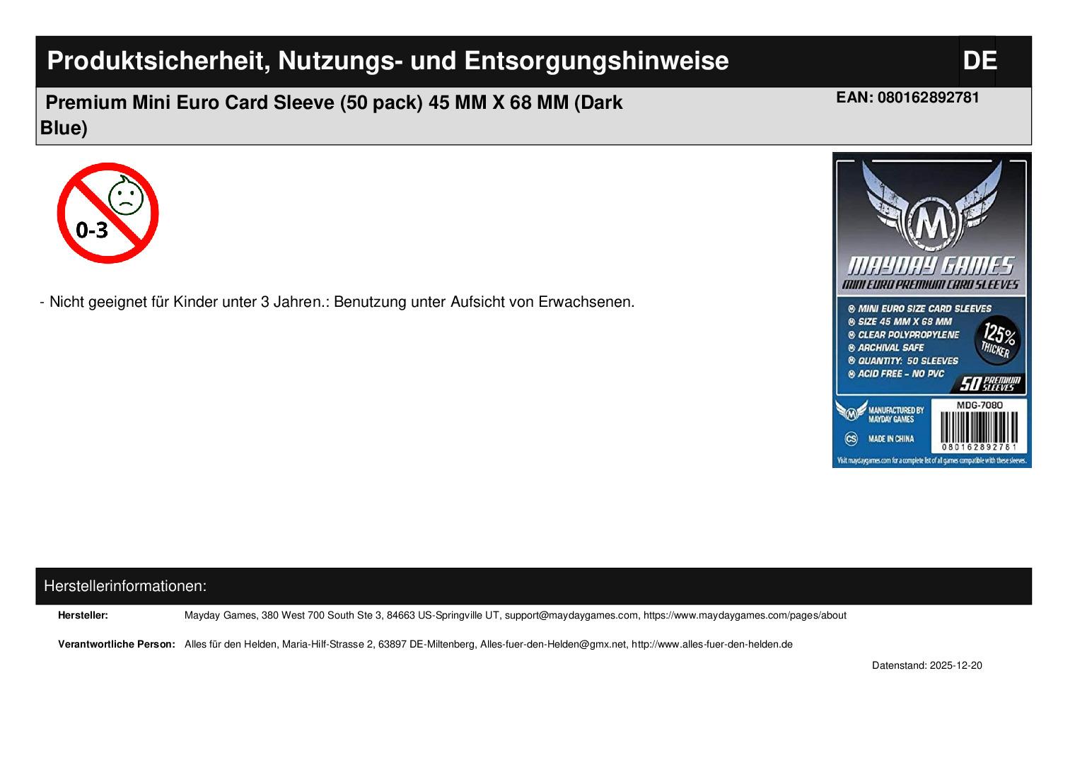 Produktinformationen "Premium Mini Euro Card Sleeve (50 pack) 45 MM X 68 MM (Dark Blue)"