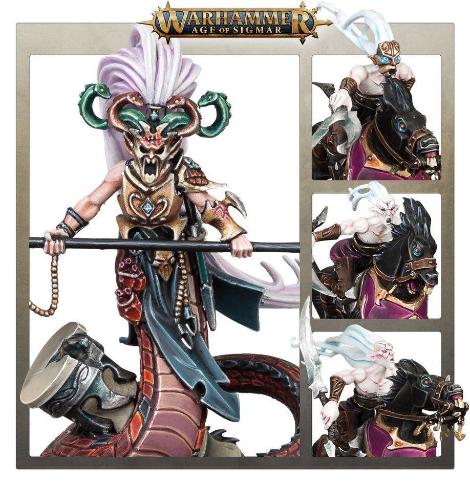 Die kriegerischen Aelf der Töchter des Khaine sind so tödlich wie anmutig und sie wollen im Namen ihrer gewalttätigen Gottheit heilige Ströme aus Blut vergießen. Die elitäre Melusai-Eisenschuppe wurde aus Tropfen von Khaines eigenem Blut geschaffen und führt ihre schlangenartigen Blutpirscherinnen in die Schlacht. Während ihre Herzsucherpfeile über Fluchfeuerhexer hinwegfliegen, schleudern diese Blitze finsterer Magie, und tobende Hexenkriegerinnen springen in die Schlacht, um dem Bluthändigen Gott ein Opfer darzubringen.