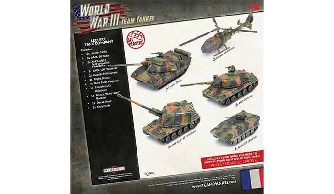 Contains three Leclerc Tanks, three AMX-30 Tanks, three AMX-AUF1 Self-propelled Howitzers, one AMX-10P Observer, two Gazelle Helicopters, two Flight Stands, four Rare Earth Magnets, one Complete A5 Rulebook, one Start Here Booklet, one French Decal Sheet and seven Unit Cards.