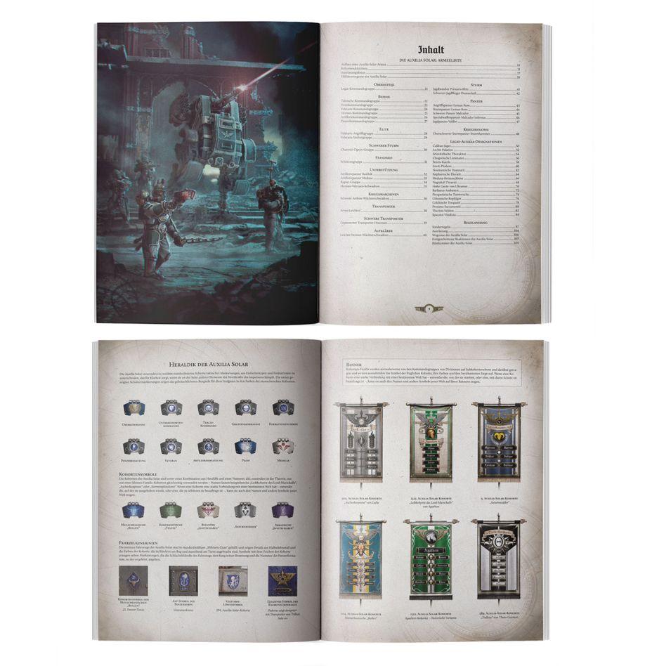 – Regeln und Einheitenprofile: Ein Leitfaden für die Armeezusammenstellung sowie Regeln für Einheiten, Waffen und Ausrüstung, auf die die Auxilila Solar in Warhammer: The Horus Heresy zugreifen kann