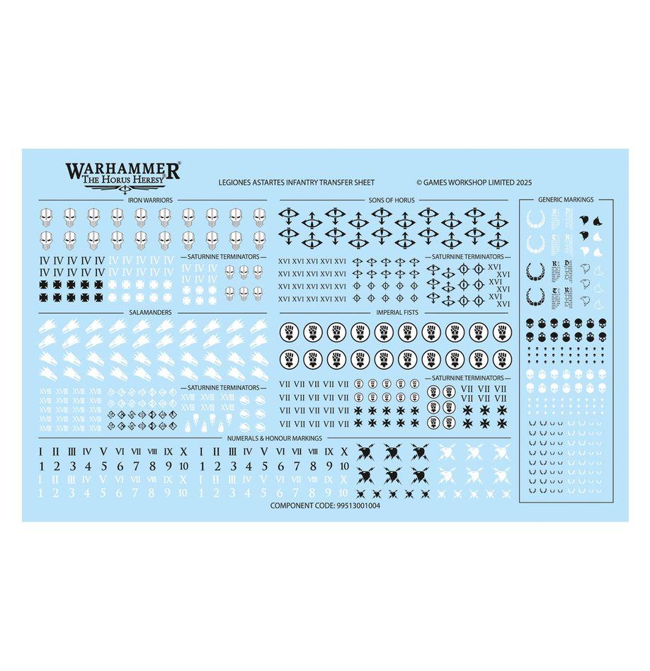 Dieser Bausatz umfasst 344 Kunststoffteile, 20x Citadel-Rundbases (32 mm) und 1x Abziehbilderbogen für Infanterie der Legionen für Horus Heresy mit 618 hochwertigen, wasserlöslichen Abziehbildern (darunter Legionssymbole der Sonst of Horus, Imperial Fists, Iron Warriors und Salamanders), mit denen du deine Miniaturen zieren kannst.