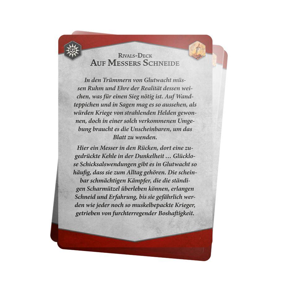 Auf Messers Schneide ist ein vollständiges und direkt spielbares Rivals-Deck, das mit allen Kriegerscharen in Warhammer Underworlds kombiniert werden kann. Öffne einfach die Box, mische die Karten und schon kannst du loslegen! Das Deck passt zum Spielstil Vielseitigkeit, der zwei oder mehr Spielstile kombiniert und eine flexible Herangehensweise an das Spiel fördert. Das Deck funktioniert daher am besten mit einer Vielseitigkeits-Kriegerschar. Verwende diese Karten so oder kombiniere sie im Nemesis-Format mit einem anderen Deck, um dein ganz persönliches Deck zu erschaffen.