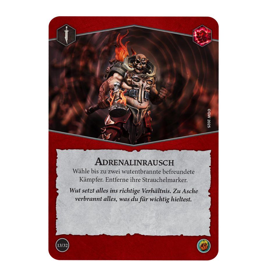 Wutenbrannte Berserker ist ein vollständiges und spielbereites Rivals-Deck, das jede Kriegerschar in Spielen von Warhammer Underworlds verwenden kann. Mach einfach das Päckchen auf, mische die Karten und du kannst loslegen! Das Deck fällt unter den Aggressions-Spielstil und führt den neuen Zustand „wutentbrannt“ ein, der die Kampffähigkeiten deiner Kämpfer verbessert. Kämpfer werden wutentbrannt, in dem sie Angreifen, sich ins Gefecht stürzen und so Wutmarker sammeln. Dieses Deck funktioniert gut mit jeder Kriegerschar des Aggressions-Spielstils. Setze diese Karten einfach so ein oder kombiniere sie mit einem anderen Set, um ein eigenes Deck des Nemesis-Formats zu schaffen.