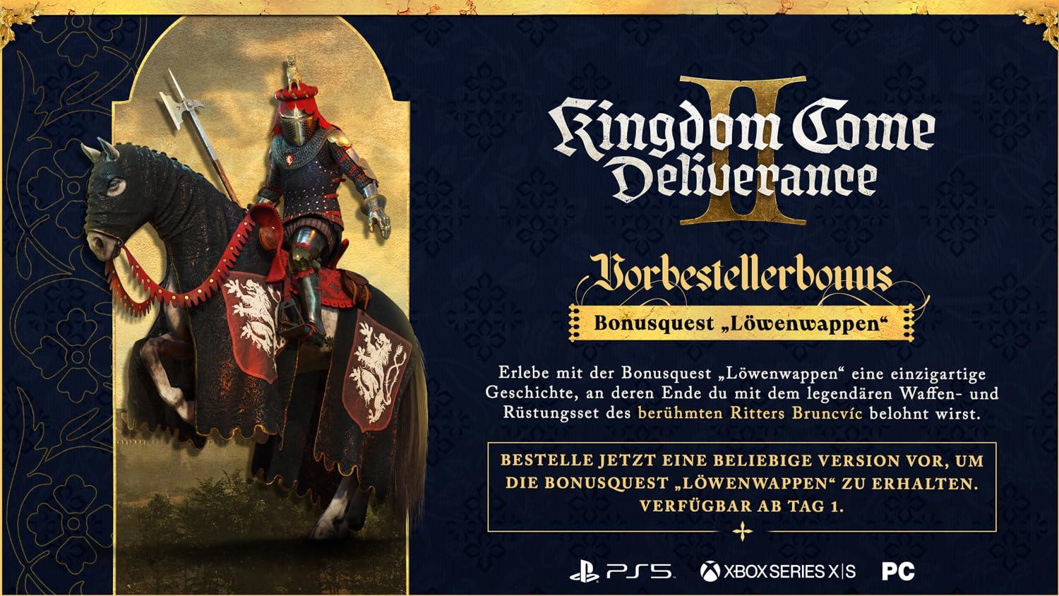 "Kingdom Come Deliverance II ist ein spannendes Action-RPG, das in den Wirren eines Bürgerkriegs im Böhmen des 15. Jahrhunderts spielt. Du bist Heinrich von Skalitz - ein gewöhnlicher Mann, der außergewöhnliche Dinge tut - und begibst dich in einer fesselnden Geschichte von Rache, Verrat und Entdeckung auf eine epische Reise ""von einer bescheidenen Schmiede zum Hof des Königs"", während du in dieser schönen, aber brutalen mittelalterlichen Welt nach deiner Bestimmung suchst. Entdecke die offene Spielwelt eines mittelalterlichen Europas - von belebten Straßen bis zu üppigen Wäldern - und erlebe ein unvergessliches Abenteuer voller Action, Spannung und Wunder."