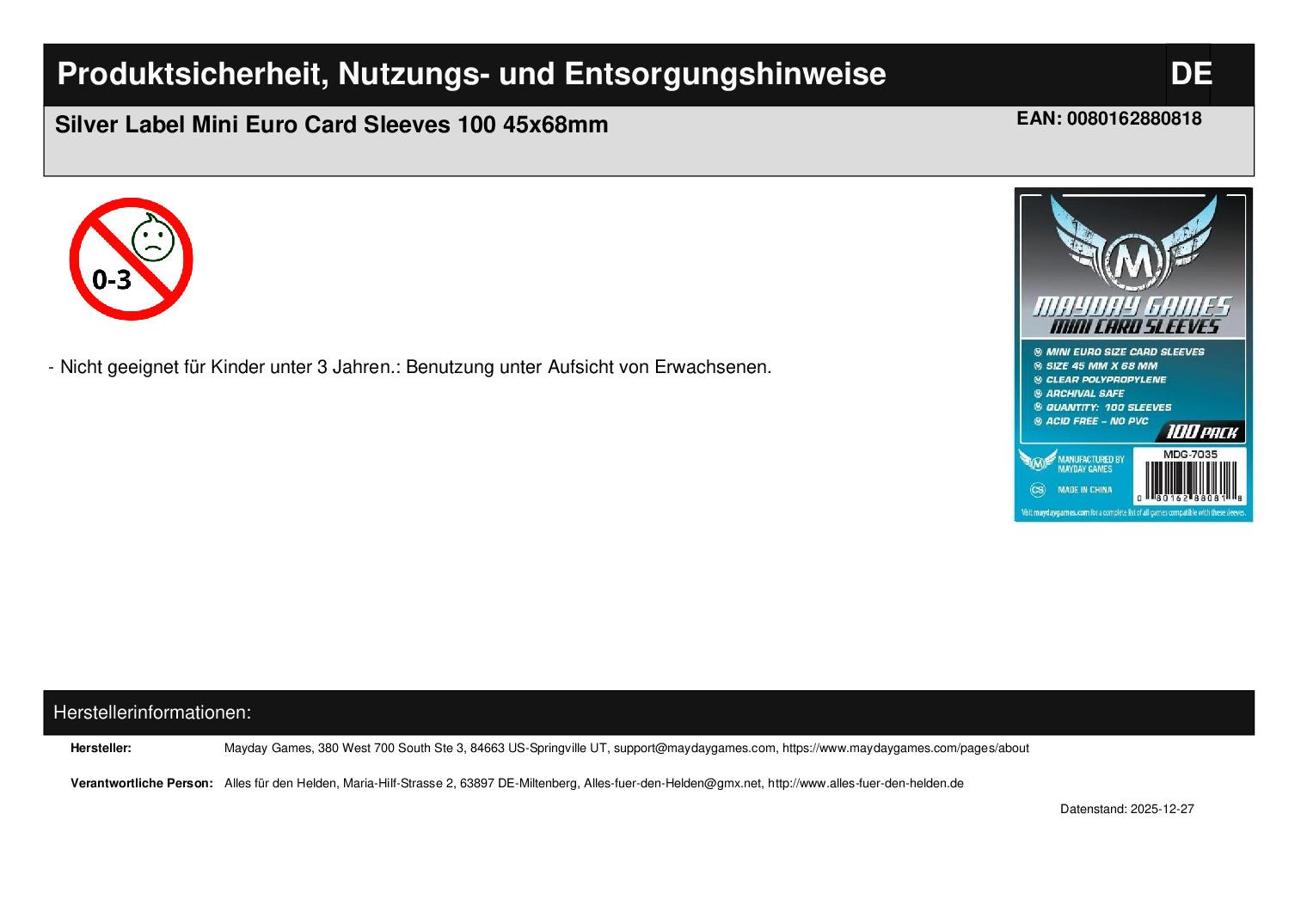 Produktinformationen "Silver Label Mini Euro Card Sleeves 100 45x68mm"