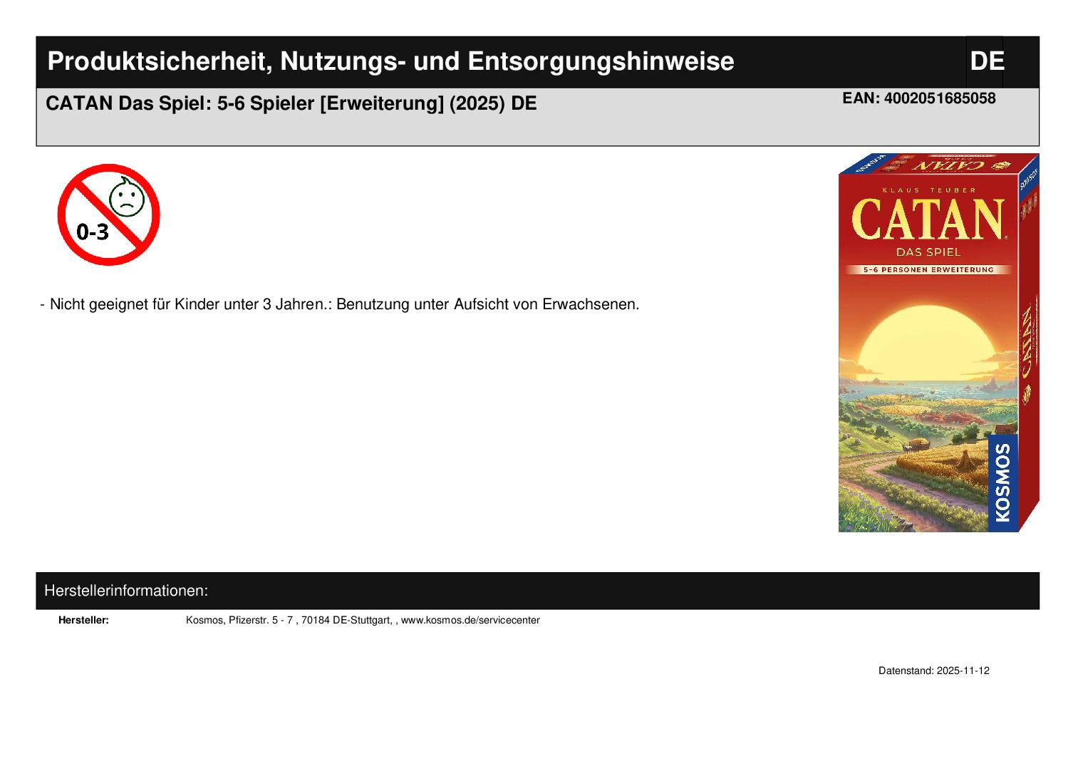 Catan wächst! Mit weiteren Landschaftsfeldern und zusätzlichen Figuren vermehren die bis zu sechs Spielerinnen und Spieler den Wohlstand Catans. Im Wettstreit miteinander bauen sie Straßen, Siedlungen und Städte, weiten Handelswege aus und setzen ihre Rohstoffe strategisch ein. Das größere Spielfeld und weitere Handelspartner bringen zusätzliche Möglichkeiten im aufregenden Spielverlauf. Die Erweiterung ist nur mit CATAN – Das Spiel spielbar. Gleich starten und Abenteuer erleben: Die Erweiterung zum preisgekrönten Klassiker von „Spiel des Jahres“-Gewinner Klaus Teuber. Für fünf bis sechs Spielerinnen und Spieler ab 10 Jahren. Diese Ausgabe von CATAN - Das Spiel - 5-6 Personen Erweiterung lässt sich mit älteren Ausgaben kombinieren