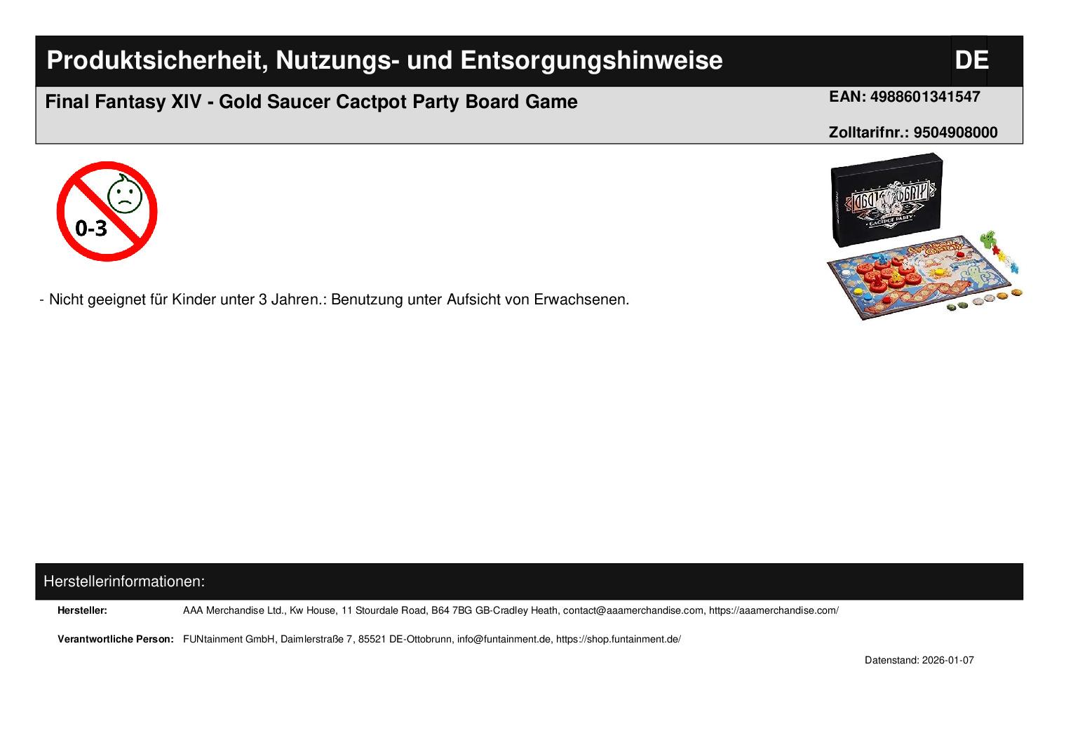 "Bringen Sie die Aufregung des Manderville Gold Saucer auf Ihren Tisch mit dem Final Fantasy XIV: Gold Saucer Cactpot Party Brettspiel. Dieses offiziell lizenzierte Spiel lässt Sie in einem Wettlauf um Glück und Strategie antreten, mit lebhaften, von Cactpot inspirierten Spielstücken und vertrauten Elementen aus Eorzeas geliebtem Freizeitpark. Perfekt für Fans, die den Nervenkitzel des Gold Saucer bequem von zu Hause aus erleben möchten.Produktdetails:Lizenz: Offiziell lizenziertes Merchandise von Final Fantasy XIVSpieler: 2-6 SpielerSetzen Sie bei jedem Wurf auf Spaß - gewinnen Sie groß oder gehen Sie nach Hause, kupo!"