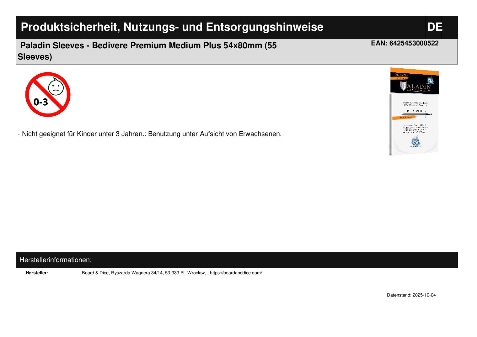 Produktinformationen "Paladin Sleeves - Bedivere Premium Medium Plus 54x80mm (55 Sleeves)"