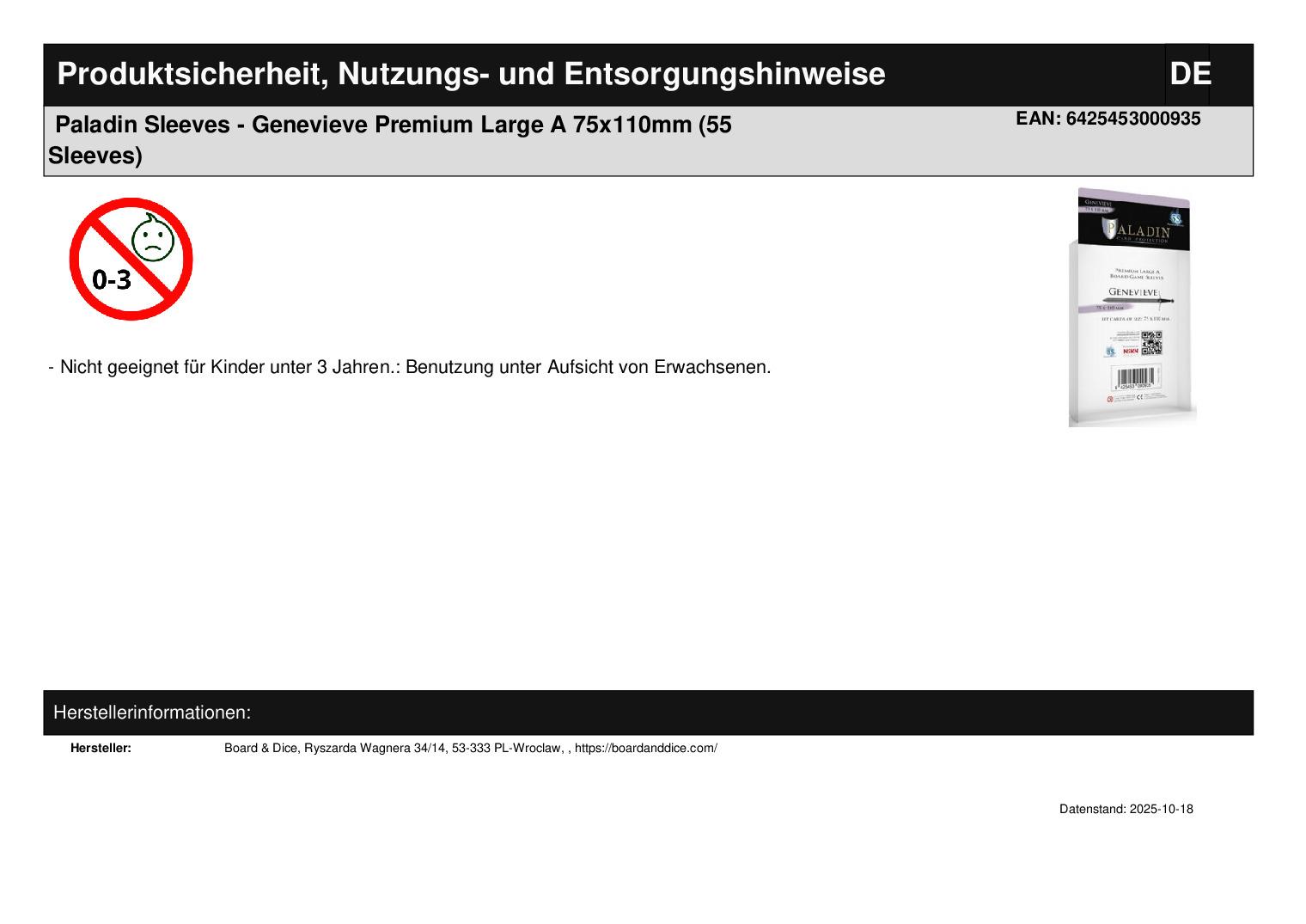 Produktinformationen "Paladin Sleeves - Genevieve Premium Large A 75x110mm (55 Sleeves)"