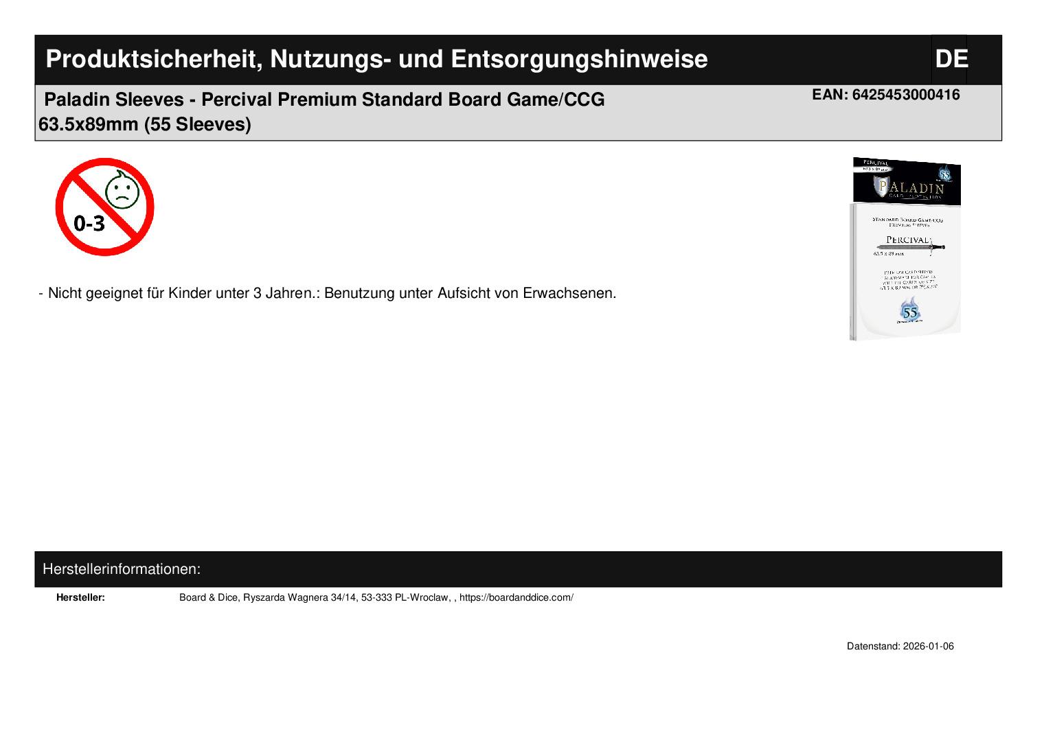 Produktinformationen "Paladin Sleeves - Percival Premium Standard Board Game/CCG 63.5x89mm (55 Sleeves)"