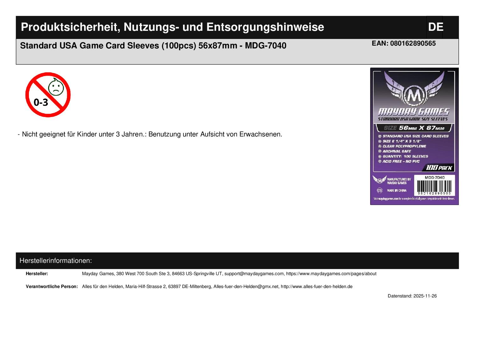 Produktinformationen "Standard USA Game Card Sleeves (100pcs) 56x87mm - MDG-7040"