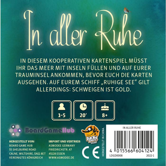 In aller Ruhe ist ein kurzweiliges kooperatives Familienspiel, bei dem die Spieler das Meer mit Inselkarten füllen und auf ihrer Trauminsel ankommen müssen, bevor ihnen die Karten ausgehen. Gesprochen werden darf dabei allerdings nicht, denn auf dem Schiff „Ruhige See“ gilt: Schweigen ist Gold.