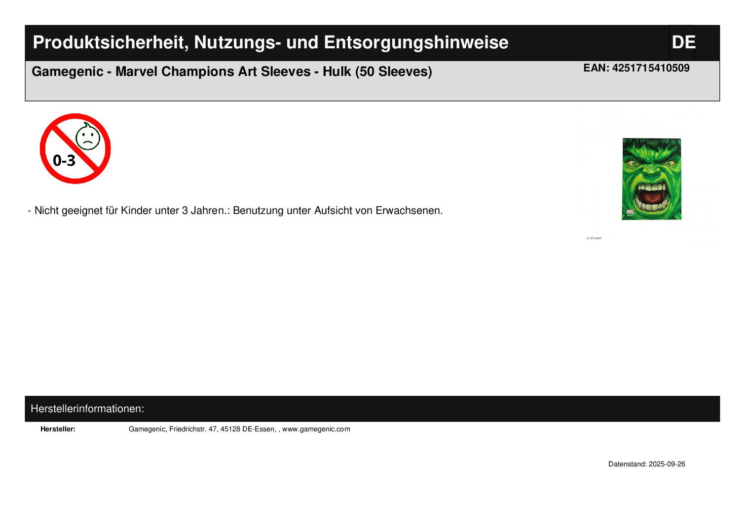 Produktinformationen "Gamegenic - Marvel Champions Art Sleeves - Hulk (50 Sleeves)"