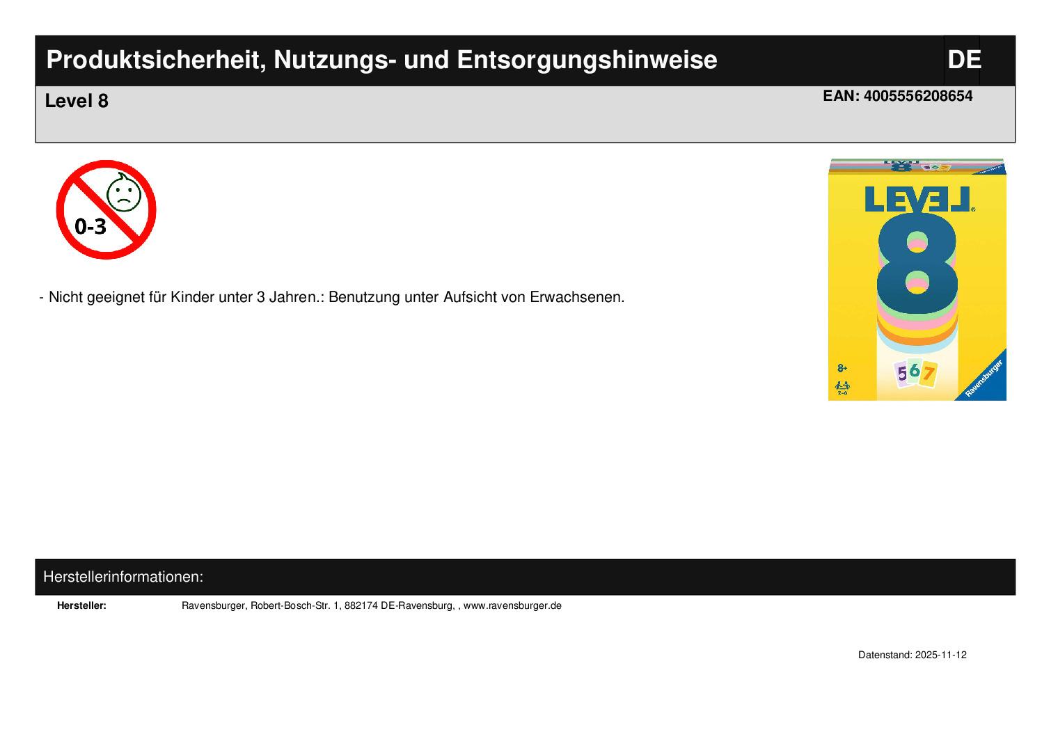 Level 8 – das Kartenspiel: 2 - 6 Spieler wetteifern Level für Level um den Sieg. Zu Beginn bekommt jeder Mitspieler eine Level-Karte mit allen acht Aufgaben sowie einen Level-Anzeiger der angibt in welchem Level man sich befindet. Wer legt die geforderten Kombinationen aus Zahlenfolgen, gleichen Karten und gleichen Farben am schnellsten aus? Einfache Regeln, schnelle Entscheidungen, großer Spielspaß! Das Familienspiel ab 8 Jahren eignet sich ideal für jeden Spieleabend.Im ersten Schritt muss der Spieler, der am Zug ist immer zuerst eine Karte aufnehmen: entweder die oberste Karte vom Nachziehstapel oder die oberste Karte von einem beliebigen Ablagestapel. Danach kann er sein aktuelles Level offen und für alle sichtbar vor sich auslegen. Im 1. Level sind das z.B. zwei Dreierfolgen. Anschließend darf er weitere Handkarten an bereits ausgelegte Karten anlegen. Am Ende des Zuges muss der Spieler eine Karte auf seinen Ablagestapel abwerfen. Ein Durchgang endet, wenn ein Spieler seine letzte Handkarte auf seinen Ablagestapel wirft. Dieser Spieler darf als Bonus ein Level überspringen.Übrigens ist es auch erlaubt, seine Mitspieler zu ärgern. Dafür gibt es die „Aussetzen“-Karte, die einen Mitspieler im nächsten Zug aussetzen lässt.
