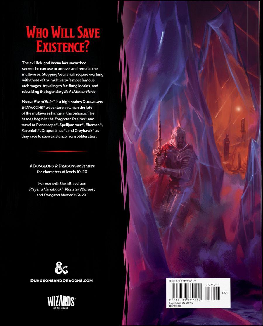 The notorious lich Vecna is weaving a ritual to eliminate good, obliterate the gods, and subjugate all worlds. To stop Vecna before he remakes the universe, the heroes work with three of the multiverse’s most famous archmages, travel to far-flung locales, and rebuild the legendary Rod of Seven Parts.