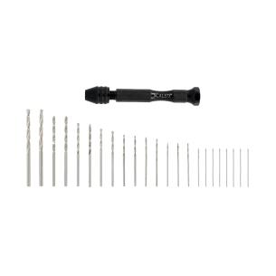 Hand drill. Includes 25 bits of different diameters.