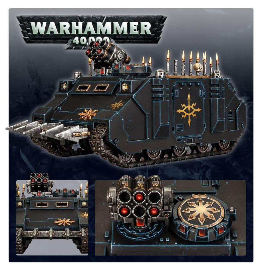 Zuverlässig, zäh und leicht zu reparieren, ist das Rhino seit längst in Vergessenheit geratenen Zeiten der wichtigste Transporter der Legionen der Space Marines. Die Rhinos, welche die Chaos Space Marines und ihre verschiedenen Verräterlegionen besitzen, sind groteske Schatten jener loyalen Truppentransporter, die mit furcheinflößenden Symbolen verziert, mit dem Blut der Gefallenen beschmiert und mit Stacheln übersät sind – um die Feinde des Chaos aufzuspießen und einzuschüchtern.