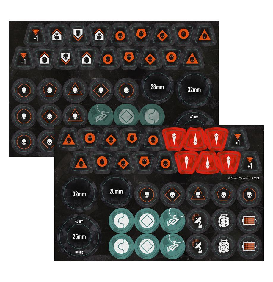 Die Box enthält auch einen Bogen mit 38 beidseitig bedruckten Markern der Klingen des Khaine, damit du in der Hitze des Gefechts deine Ausrüstung und Spieleffekte im Blick behältst.