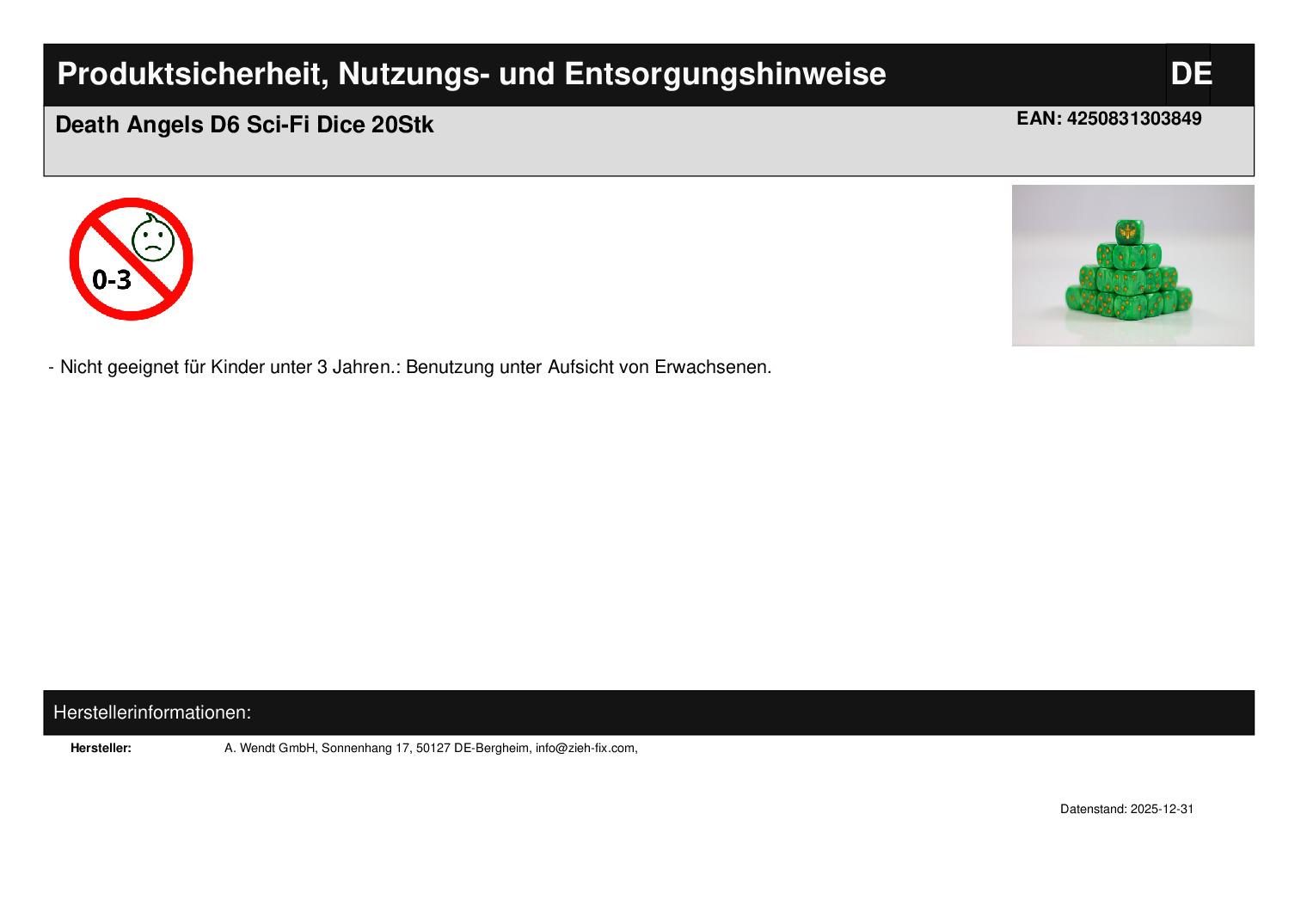 Death Angels - 20 StückDas Death Angels Würfelset glänzt in tiefem Smaragdgrün - ein Sinnbild für Ehre, Loyalität und das schwere Erbe eines verschwiegenen Ordens. Die goldenen Augen dieser Würfel erinnern an uralte Schwüre und gefallene Brüder, deren Schuld noch nicht getilgt ist. Mit jedem Wurf erzittert das Schlachtfeld unter der stillen Wut jener, die nie vergessen - und nie vergeben. Geprägt vom Zeichen des geflügelten Schwerts, stehen diese Würfel für disziplinierte Gewalt und unerbittliche Jagd. DiceWyrm Death Angels - für Krieger mit Schatten im Herzen und Gerechtigkeit im Blick.Sci-FI WürfelTauche ein in ferne Galaxien mit den SciFi-Würfelsets von DiceWyrm - 20-teilig, präzise gefertigt und inspiriert von den Abgründen einer düsteren Zukunft. Jedes Set vereint futuristisches Design mit funktionaler Klarheit und bringt kybernetische Muster, maschinelle Gravuren und kalte Eleganz auf deinen Spieltisch. Ob für brutale Schlachten, taktische Simulationen oder dystopische Erzählungen - diese Würfel sind gemacht für harte Entscheidungen in rauen Welten. Ausgewogen im Wurf, robust im Einsatz, bereit für das Unbekannte. DiceWyrm SciFi - für Spielende, die in Stahl und Schatten würfeln.DiceWyrmDiceWyrm steht für meisterhafte Würfel, geschmiedet für Abenteurer, Strategen und Geschichtenerzähler. Unsere Würfel vereinen höchste Präzision mit langlebiger Qualität und sind gemacht, um Schlachten zu schlagen - ob in finsteren Dungeons oder weit entfernten Galaxien. Jedes Set wird mit Liebe zum Detail gefertigt und reflektiert die Vielfalt fantastischer Welten, von epischer Fantasy bis zu düsterer Science-Fiction.Ob für Pen & Paper, Tabletop oder TCG - DiceWyrm bietet dir das passende Werkzeug, um dein Schicksal stilvoll zu besiegeln. Unsere Designs reichen von mystisch und uralt bis futuristisch und technisch. Sammler und Spieler schätzen die Balance, das Finish und das charakterstarke Design jeder Edition. DiceWyrm - weil kein Wurf dem Zufall überlassen bleiben sollte.Denn jedes Spiel verdient es, episch zu sein. Und jeder Wurf sollte sich legendär anfühlen.The Wyrm waits! Roll Boldly.