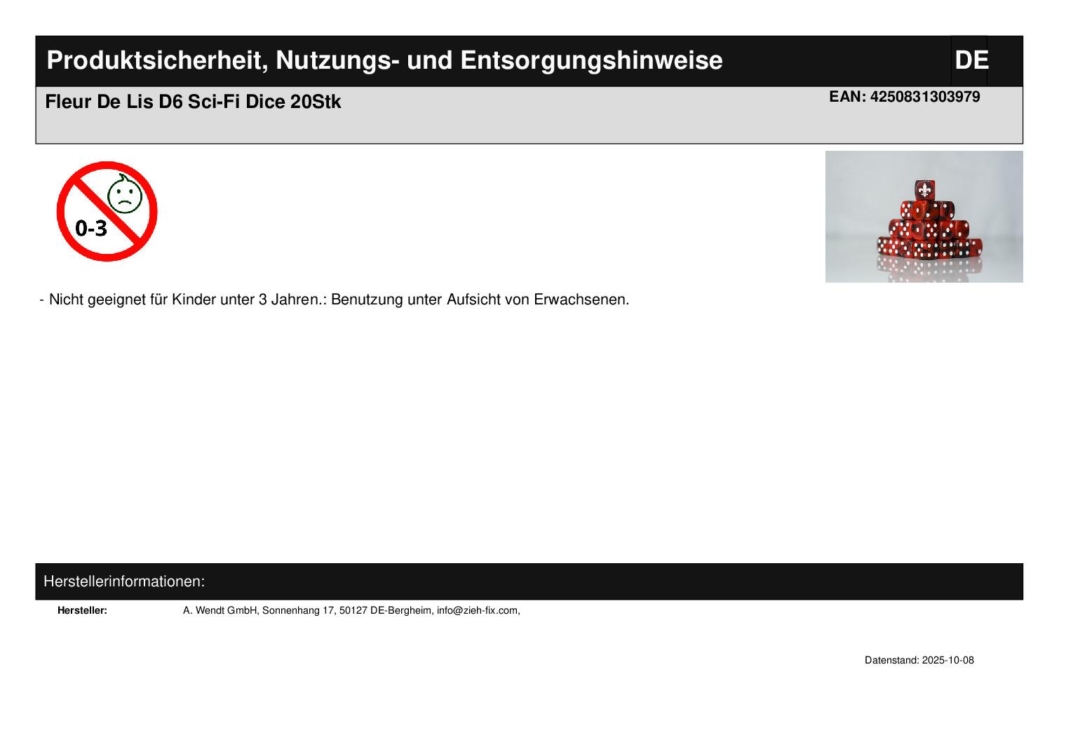 Fleur De Lis - 20 StückDas Fleur De Lis Würfelset brennt in leuchtendem Blutrot, durchzogen von schwärzlicher Glut - ein Symbol für fanatischen Glauben und heilige Rache. Das weiße Lilienemblem mit Totenschädel verkörpert Reinheit im Feuer und den unerschütterlichen Willen, Ketzer, Xenos und Dämonen zu vernichten. Jeder Wurf ist ein Gebet, gesprochen mit Boltern und Flammenwerfern. Diese Würfel gehören Kriegerinnen, die mit Hymnen auf den Lippen und Zorn im Herzen in die Schlacht ziehen. DiceWyrm Fleur De Lis - der Glaube brennt heller als jede Flamme.Sci-FI WürfelTauche ein in ferne Galaxien mit den SciFi-Würfelsets von DiceWyrm - 20-teilig, präzise gefertigt und inspiriert von den Abgründen einer düsteren Zukunft. Jedes Set vereint futuristisches Design mit funktionaler Klarheit und bringt kybernetische Muster, maschinelle Gravuren und kalte Eleganz auf deinen Spieltisch. Ob für brutale Schlachten, taktische Simulationen oder dystopische Erzählungen - diese Würfel sind gemacht für harte Entscheidungen in rauen Welten. Ausgewogen im Wurf, robust im Einsatz, bereit für das Unbekannte. DiceWyrm SciFi - für Spielende, die in Stahl und Schatten würfeln.DiceWyrmDiceWyrm steht für meisterhafte Würfel, geschmiedet für Abenteurer, Strategen und Geschichtenerzähler. Unsere Würfel vereinen höchste Präzision mit langlebiger Qualität und sind gemacht, um Schlachten zu schlagen - ob in finsteren Dungeons oder weit entfernten Galaxien. Jedes Set wird mit Liebe zum Detail gefertigt und reflektiert die Vielfalt fantastischer Welten, von epischer Fantasy bis zu düsterer Science-Fiction.Ob für Pen & Paper, Tabletop oder TCG - DiceWyrm bietet dir das passende Werkzeug, um dein Schicksal stilvoll zu besiegeln. Unsere Designs reichen von mystisch und uralt bis futuristisch und technisch. Sammler und Spieler schätzen die Balance, das Finish und das charakterstarke Design jeder Edition. DiceWyrm - weil kein Wurf dem Zufall überlassen bleiben sollte.Denn jedes Spiel verdient es, episch zu sein. Und jeder Wurf sollte sich legendär anfühlen.The Wyrm waits! Roll Boldly.Dies ist ein Original von DiceWyrm und stehen in keiner Verbindung zu Mantic Games, Games Workshop, Kings of War, Star Wars oder anderen Marken.