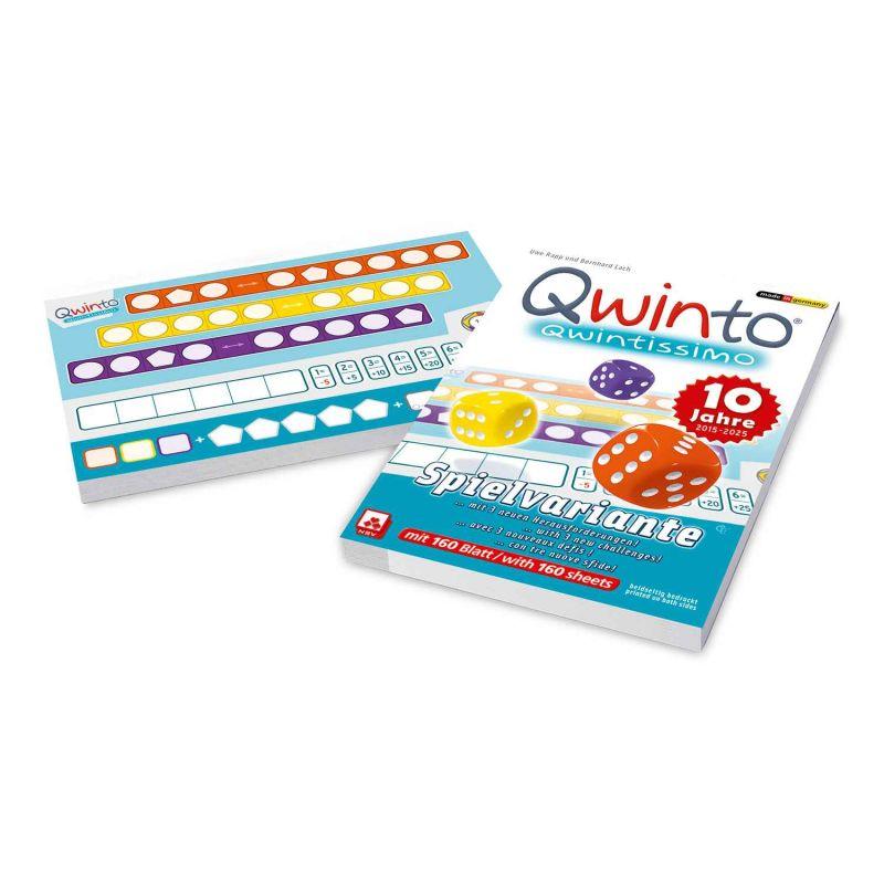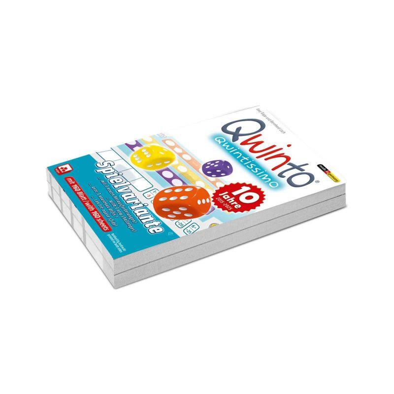 Das Würfelspiel QWINTO, das auf den Spuren des Bestsellers Qwixx wandelt, hat seit nunmehr 10 Jahren treue Fans. Das verdient eine angemessene Würdigung. Zur Feier des diesjährigen Jubiläums gibt es mit QWINTISSIMO den allerersten Variantenblock für das Spiel Qwinto. Am Grundspiel ändert sich nichts. Ziel ist es, durch Würfeln die drei Farbreihen mit von links nach rechts aufsteigenden Zahlen zu füllen. Innerhalb einer Spalte darf dabei nicht zweimal die gleiche Zahl stehen. Bei einem Wurf können alle drei Farbwürfel verwendet werden, muss aber nicht. Das entscheidet die aktive Person jeden Zug aufs Neue. QWINTISSIMO fügt dem Ganzen nun drei neue Elemente hinzu, die eine Partie um spannende taktische Nuancen erweitert. Die Leerstellen in den Farbreihen bekommen mit „Mut zur Lücke!“ besondere Bedeutung. Werden die Felder links und rechts der Lücke mit Zahlen gefüllt, zählt die Differenz zwischen den beiden Werten als Bonuspunkte. Beim zweiten Element „Nur ich!“ erklärt sich die Regel durch den Titel fast von selbst. Die aktive Person darf einmal pro Spiel das gewürfelte Ergebnis für sich allein beanspruchen, der Rest geht leer aus. Das dritte Element „Mehrlinge“ führt eine Sonderregel fürFehlwürfe ein. Wird eine Zahl mehrfach als Fehlwurf eingetragen, verwandeln sich die sonst üblichen Minuspunkte in Pluspunkte. Je öfter das mit einer Zahl passiert, desto höher wird am Ende das Plus. QWINTISSIMO mit all seinen Variationen ist der perfekte Anlass, um Qwinto wieder oder aufs Neue kennenzulernen. Sein schnell erklärter, eingängiger Roll & Write-Mechanismus sorgt dafür, dass es oft nicht nur bei einer Runde bleibt.Inhalt: 2 x Blöcke I 1 x Spielanleitung