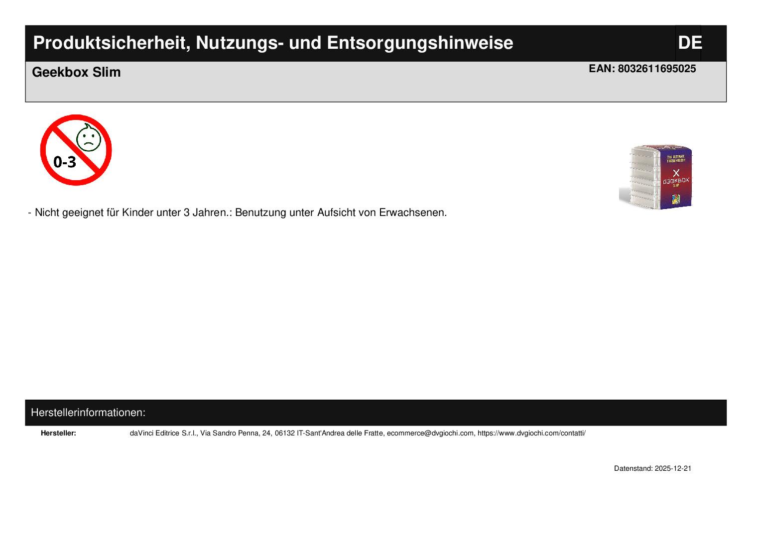 daVinci Editrice S.r.l. Via Sandro Penna, 24 06132 Sant'Andrea delle Fratte ecommerce@dvgiochi.com https://www.dvgiochi.com/contatti/ WEEE-Nummer: