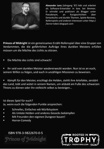 Princes of Midnight ist ein gemeinsames Erzähl-Rollenspiel über eine Gruppe von Verdammten, die die gefährlichen Aufträge ihres dunklen Meisters erfüllen müssen um die Mächte des Lichts zu stürzen. In diesem A5-Rollenspiel schlüpfen Spieler in die Rolle von Untoten, um als Skelette, Zombies oder Gespenster mit Gewitztheit und einem großen Quäntchen Glück für den dunklen Meister die Welltherrschaft an sich zu reißen. Beinhaltet Oneshot-Spielmöglichkeit und Kampagnenspiel. Komplettes Spiel in einem Buch!
