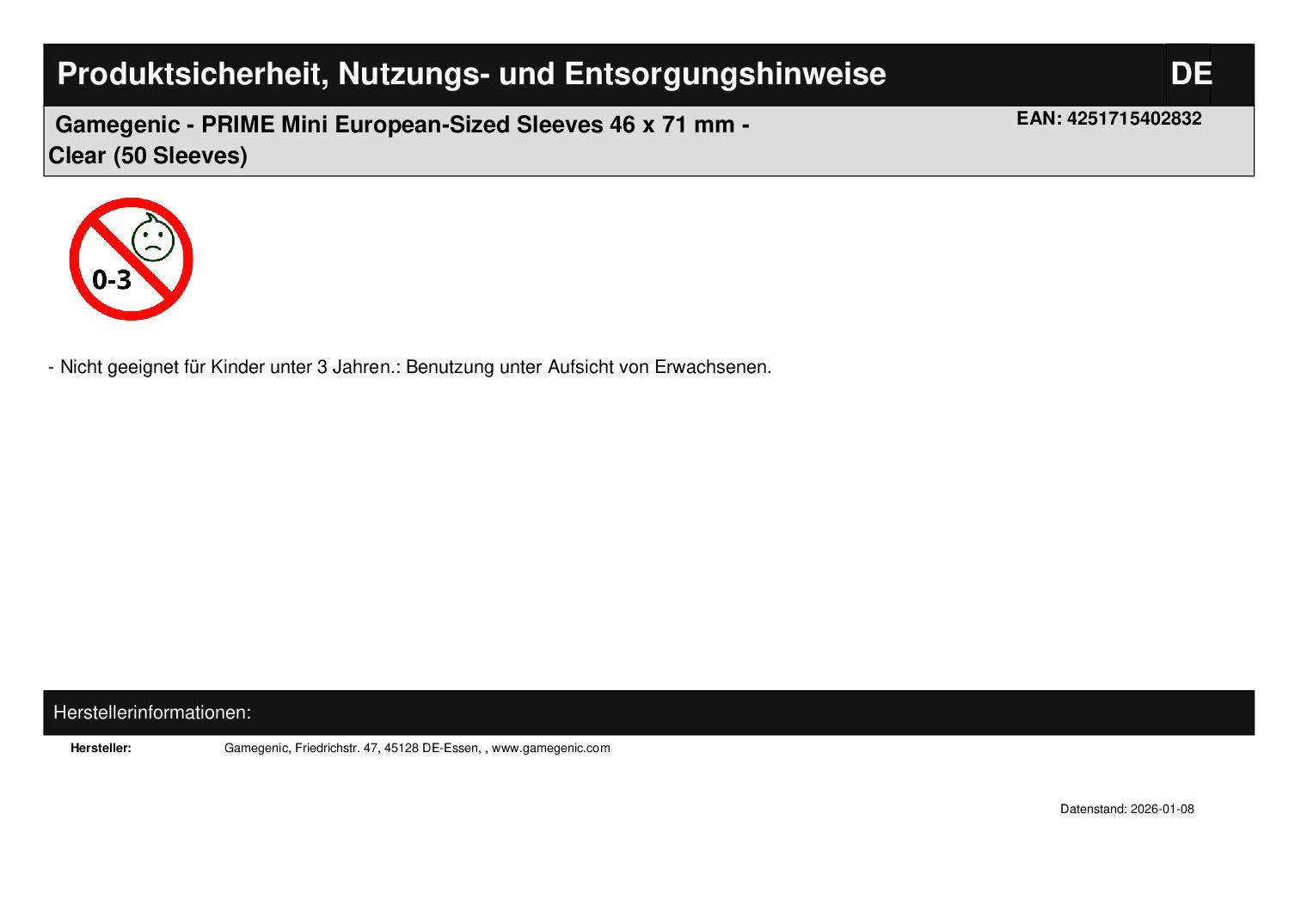 Produktinformationen "Gamegenic - PRIME Mini European-Sized Sleeves 46 x 71 mm - Clear (50 Sleeves)"