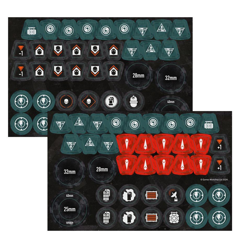 Die Box enthält auch einen Bogen mit 28 beidseitig bedruckten Tempestus-Aquilons-Markern, damit du in der Hitze des Gefechts deine Ausrüstung und Spieleffekte im Blick behältst.